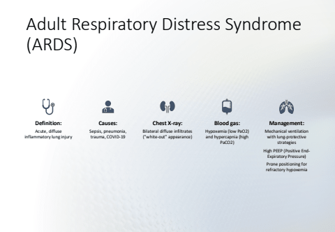 Adult Respiratory Distress Syndrome (ARDS)Definition:Acute, diffuse inflammatory lung injuryCauses:Sepsis, pneumonia, trauma, COVID-19Chest X-ray:Bilateral diffuse infiltrates (\Blood gas:Hypoxemia (low PaO2) and hypercapnia (high PaCO2)Management:Mechanical ventilation with lung-protective strategiesHigh PEEP (Positive EndExpiratory Pressure)Prone positioning for refractory hypoxemia