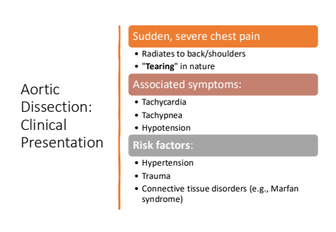 Aortic Dissection: Clinical PresentationSudden, severe chest pain%u2022 Radiates to back/shoulders%u2022 \Associated symptoms:%u2022 Tachycardia%u2022 Tachypnea%u2022 HypotensionRisk factors:%u2022 Hypertension%u2022 Trauma%u2022 Connective tissue disorders (e.g., Marfan syndrome)