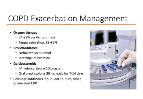 COPD Exacerbation Management%u2022 Oxygen therapy:%u2022 24-28% via Venturi mask%u2022 Target saturation: 88-92%%u2022 Bronchodilators:%u2022 Nebulized salbutamol%u2022 Ipratropium bromide%u2022 Corticosteroids:%u2022 IV hydrocortisone 100 mg or%u2022 Oral prednisolone 30 mg daily for 7-14 days%u2022 Consider antibiotics if purulent sputum, fever, or elevated CRP