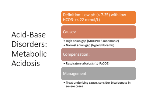 Acid-Base Disorders: Metabolic AcidosisDefinition: Low pH (< 7.35) with low HCO3- (< 22 mmol/L)Causes:%u2022 High anion gap (MUDPILES mnemonic)%u2022 Normal anion gap (hyperchloremic)Compensation:%u2022 Respiratory alkalosis (%u2193 PaCO2)Management:%u2022 Treat underlying cause, consider bicarbonate in severe cases