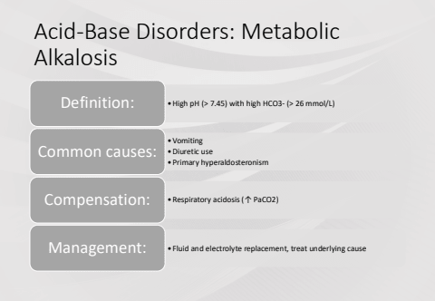 Acid-Base Disorders: Metabolic AlkalosisDefinition: %u2022High pH (> 7.45) with high HCO3- (> 26 mmol/L)%u2022Vomiting%u2022Diuretic use%u2022Primary hyperaldosteronismCommon causes:Compensation: %u2022Respiratory acidosis (%u2191 PaCO2)Management: %u2022Fluid and electrolyte replacement, treat underlying cause