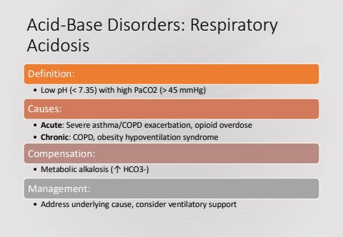Acid-Base Disorders: Respiratory AcidosisDefinition:%u2022 Low pH (< 7.35) with high PaCO2 (> 45 mmHg)Causes:%u2022 Acute: Severe asthma/COPD exacerbation, opioid overdose%u2022 Chronic: COPD, obesity hypoventilation syndromeCompensation:%u2022 Metabolic alkalosis (%u2191 HCO3-)Management:%u2022 Address underlying cause, consider ventilatory support