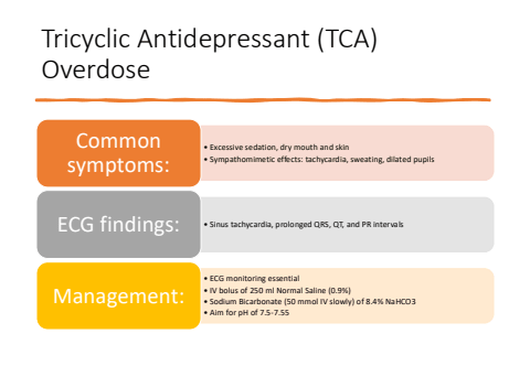 Tricyclic Antidepressant (TCA) Overdose%u2022 Excessive sedation, dry mouth and skin%u2022 Sympathomimetic effects: tachycardia, sweating, dilated pupilsCommon symptoms:ECG findings: %u2022 Sinus tachycardia, prolonged QRS, QT, and PR intervals%u2022 ECG monitoring essential%u2022 IV bolus of 250 ml Normal Saline (0.9%)%u2022 Sodium Bicarbonate (50 mmol IV slowly) of 8.4% NaHCO3%u2022 Aim for pH of 7.5-7.55Management: