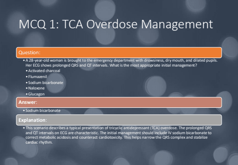 MCQ 1: TCA Overdose ManagementQuestion:%u2022A 28-year-old woman is brought to the emergency department with drowsiness, dry mouth, and dilated pupils. Her ECG shows prolonged QRS and QT intervals. What is the most appropriate initial management?%u2022Activated charcoal%u2022 Flumazenil%u2022 Sodium bicarbonate%u2022Naloxone%u2022GlucagonAnswer:%u2022 Sodium bicarbonateExplanation:%u2022 This scenario describes a typical presentation of tricyclic antidepressant (TCA) overdose. The prolonged QRS and QT intervals on ECG are characteristic. The initial management should include IV sodium bicarbonate to correct metabolic acidosis and counteract cardiotoxicity. This helps narrow the QRS complex and stabilize cardiac rhythm.