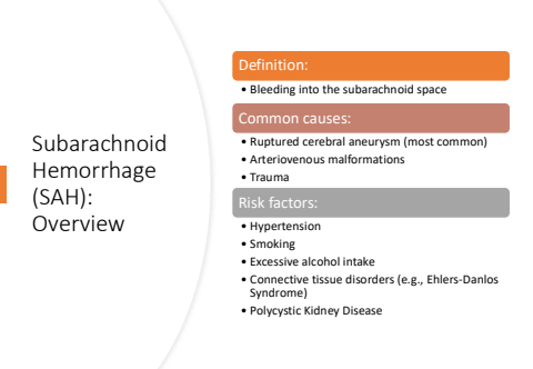 Subarachnoid Hemorrhage (SAH): OverviewDefinition:%u2022 Bleeding into the subarachnoid spaceCommon causes:%u2022 Ruptured cerebral aneurysm (most common)%u2022 Arteriovenous malformations%u2022 TraumaRisk factors:%u2022 Hypertension%u2022 Smoking%u2022 Excessive alcohol intake%u2022 Connective tissue disorders (e.g., Ehlers-Danlos Syndrome)%u2022 Polycystic Kidney Disease