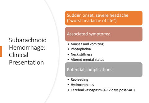 Subarachnoid Hemorrhage: Clinical PresentationSudden onset, severe headache (\Associated symptoms:%u2022 Nausea and vomiting%u2022 Photophobia%u2022 Neck stiffness%u2022 Altered mental statusPotential complications:%u2022 Rebleeding%u2022 Hydrocephalus%u2022 Cerebral vasospasm (4-12 days post-SAH)