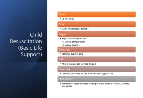 Child Resuscitation (Basic Life Support)Open%u2022 Open airwayGive%u2022 Give 5 initial rescue breathsBegin%u2022 Begin chest compressions:%u2022 15 chest compressions%u2022 2 rescue breathsContinue%u2022 Continue cycle of 15:2Call%u2022 After 1 minute, call for help if aloneContinue%u2022 Continue until help arrives or child shows signs of lifeRemember%u2022 Remember: Depth and rate of compressions differ for infants, children, and adults.