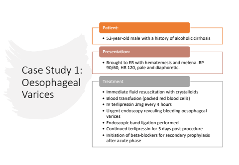 Case Study 1: Oesophageal Varices%u2022 52-year-old male with a history of alcoholic cirrhosisPatient:%u2022 Brought to ER with hematemesis and melena. BP 90/60, HR 120, pale and diaphoretic.Presentation:%u2022 Immediate fluid resuscitation with crystalloids%u2022 Blood transfusion (packed red blood cells)%u2022 IV terlipressin 2mg every 4 hours%u2022 Urgent endoscopy revealing bleeding oesophageal varices%u2022 Endoscopic band ligation performed%u2022 Continued terlipressin for 5 days post-procedure%u2022 Initiation of beta-blockers for secondary prophylaxis after acute phaseTreatment