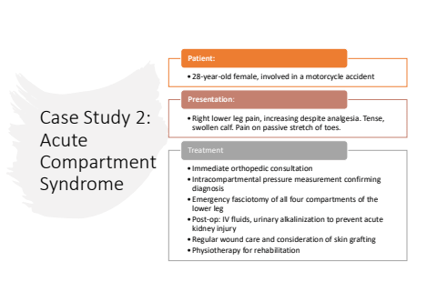 Case Study 2: Acute Compartment Syndrome%u202228-year-old female, involved in a motorcycle accidentPatient:%u2022Right lower leg pain, increasing despite analgesia. Tense, swollen calf. Pain on passive stretch of toes.Presentation:%u2022Immediate orthopedic consultation%u2022Intracompartmental pressure measurement confirming diagnosis%u2022Emergency fasciotomy of all four compartments of the lower leg%u2022Post-op: IV fluids, urinary alkalinization to prevent acute kidney injury%u2022Regular wound care and consideration of skin grafting%u2022Physiotherapy for rehabilitationTreatment