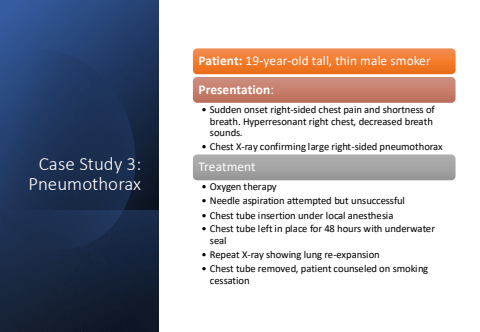Case Study 3: PneumothoraxPatient: 19-year-old tall, thin male smokerPresentation:%u2022 Sudden onset right-sided chest pain and shortness of breath. Hyperresonant right chest, decreased breath sounds.%u2022 Chest X-ray confirming large right-sided pneumothoraxTreatment%u2022 Oxygen therapy%u2022 Needle aspiration attempted but unsuccessful%u2022 Chest tube insertion under local anesthesia%u2022 Chest tube left in place for 48 hours with underwater seal%u2022 Repeat X-ray showing lung re-expansion%u2022 Chest tube removed, patient counseled on smoking cessation