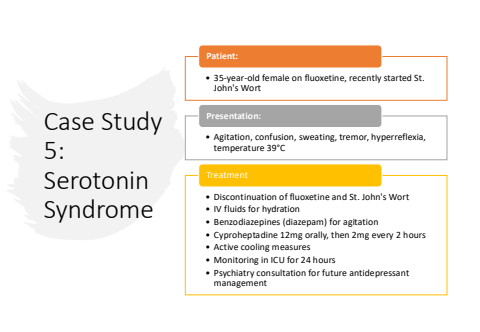Case Study 5: Serotonin Syndrome%u2022 35-year-old female on fluoxetine, recently started St. John's WortPatient:%u2022 Agitation, confusion, sweating, tremor, hyperreflexia, temperature 39%u00b0CPresentation:%u2022 Discontinuation of fluoxetine and St. John's Wort%u2022 IV fluids for hydration%u2022 Benzodiazepines (diazepam) for agitation%u2022 Cyproheptadine 12mg orally, then 2mg every 2 hours%u2022 Active cooling measures%u2022 Monitoring in ICU for 24 hours%u2022 Psychiatry consultation for future antidepressant managementTreatment