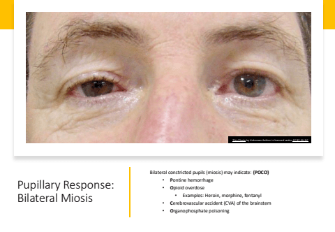 Pupillary Response: Bilateral MiosisBilateral constricted pupils (miosis) may indicate: (POCO)%u2022 Pontine hemorrhage%u2022 Opioid overdose%u2022 Examples: Heroin, morphine, fentanyl%u2022 Cerebrovascular accident (CVA) of the brainstem%u2022 Organophosphate poisoningThis Photo by Unknown Author is licensed under CC BY-SA-NC