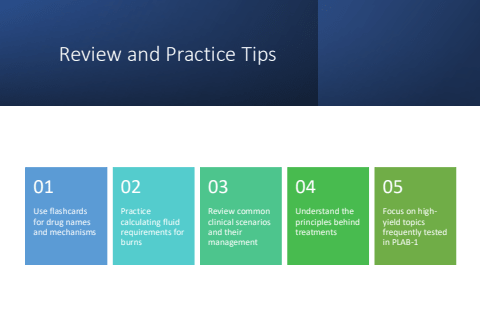 Review and Practice TipsUse flashcards for drug names and mechanisms01Practice calculating fluid requirements for burns02Review common clinical scenarios and their management03Understand the principles behind treatments04Focus on highyield topics frequently tested in PLAB-105