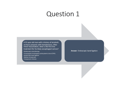 Question 1A 55-year-old man with a history of alcoholic cirrhosis presents with hematemesis. After initial resuscitation, what is the first-line treatment for his likely oesophageal varices?%u2022Endoscopic sclerotherapy%u2022Transjugular intrahepatic portosystemic shunt (TIPS)%u2022Endoscopic band ligation%u2022Balloon tamponade%u2022Vasopressin infusionAnswer: Endoscopic band ligation