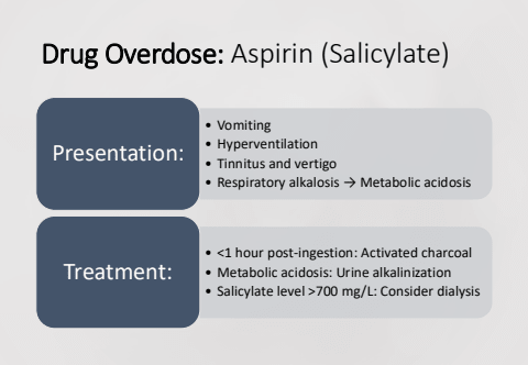Drug Overdose: Aspirin (Salicylate)%u2022 Vomiting%u2022 Hyperventilation%u2022 Tinnitus and vertigo%u2022 Respiratory alkalosis %u2192 Metabolic acidosisPresentation:%u2022 <1 hour post-ingestion: Activated charcoal%u2022 Metabolic acidosis: Urine alkalinization%u2022 Salicylate level >700 mg/L: Consider dialysisTreatment:
