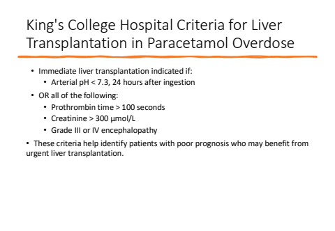 King's College Hospital Criteria for Liver Transplantation in Paracetamol Overdose%u2022 Immediate liver transplantation indicated if:%u2022 Arterial pH < 7.3, 24 hours after ingestion%u2022 OR all of the following:%u2022 Prothrombin time > 100 seconds%u2022 Creatinine > 300 %u00b5mol/L%u2022 Grade III or IV encephalopathy%u2022 These criteria help identify patients with poor prognosis who may benefit from urgent liver transplantation.