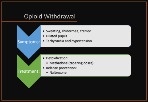 Opioid WithdrawalSymptoms:%u2022 Sweating, rhinorrhea, tremor%u2022 Dilated pupils%u2022 Tachycardia and hypertensionTreatment:%u2022 Detoxification:%u2022 Methadone (tapering doses)%u2022 Relapse prevention:%u2022 Naltrexone