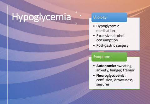 Hypoglycemia%u2022 Hypoglycemic medications%u2022 Excessive alcohol consumption%u2022 Post-gastric surgeryEtiology:%u2022 Autonomic: sweating, anxiety, hunger, tremor%u2022 Neuroglycopenic:confusion, drowsiness, seizuresSymptoms: