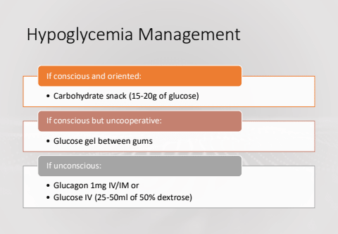 Hypoglycemia Management%u2022 Carbohydrate snack (15-20g of glucose)If conscious and oriented:%u2022 Glucose gel between gumsIf conscious but uncooperative:%u2022 Glucagon 1mg IV/IM or%u2022 Glucose IV (25-50ml of 50% dextrose)If unconscious: