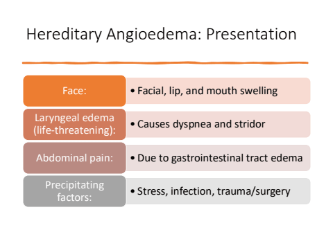 Hereditary Angioedema: PresentationFace: %u2022 Facial, lip, and mouth swelling%u2022 Causes dyspnea and stridor Laryngeal edema (life-threatening):Abdominal pain: %u2022 Due to gastrointestinal tract edema%u2022 Stress, infection, trauma/surgery Precipitating factors: