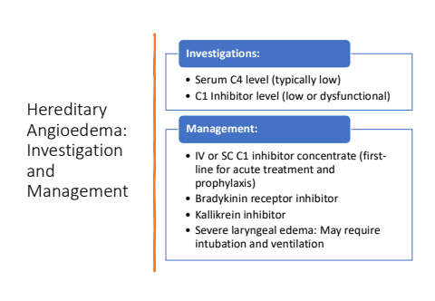 Hereditary Angioedema: Investigation and Management%u2022 Serum C4 level (typically low)%u2022 C1 Inhibitor level (low or dysfunctional)Investigations:%u2022 IV or SC C1 inhibitor concentrate (firstline for acute treatment and prophylaxis)%u2022 Bradykinin receptor inhibitor%u2022 Kallikrein inhibitor%u2022 Severe laryngeal edema: May require intubation and ventilationManagement: