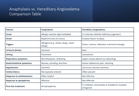 Anaphylaxis vs. Hereditary AngioedemaComparison TableFeature Anaphylaxis Hereditary AngioedemaCause Allergic reaction (IgE-mediated) C1 esterase inhibitor deficiency (genetic)Onset Rapid (minutes to hours) Gradual (hours to days)Triggers Allergens (e.g., foods, drugs, insect stings) Stress, trauma, infections, hormonal changesUrticaria (hives) Common RareItching Prominent UncommonRespiratory symptoms Bronchospasm, wheezing Upper airway edema (no wheezing)Gastrointestinal symptoms Nausea, vomiting, diarrhea Severe abdominal pain, vomitingHypotension Common Can occur, but less commonFamily history Not typically relevant Often presentResponse to antihistamines Often helpful Not effectiveResponse to epinephrine Effective Not effectiveFirst-line treatment IM epinephrine C1 inhibitor concentrate or bradykinin receptor antagonist