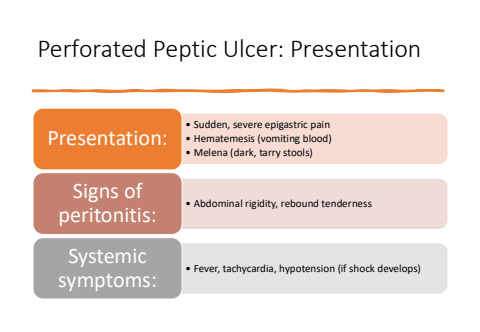 Perforated Peptic Ulcer: Presentation%u2022 Sudden, severe epigastric pain%u2022 Hematemesis (vomiting blood)%u2022 Melena (dark, tarry stools)Presentation:%u2022 Abdominal rigidity, rebound tendernessSigns of peritonitis:%u2022 Fever, tachycardia, hypotension (if shock develops)Systemic symptoms: