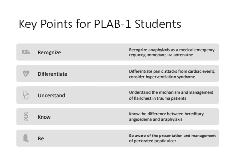 Key Points for PLAB-1 StudentsRecognize Recognize anaphylaxis as a medical emergency requiring immediate IM adrenalineDifferentiate Differentiate panic attacks from cardiac events; consider hyperventilation syndromeUnderstand Understand the mechanism and management of flail chest in trauma patientsKnow Know the difference between hereditary angioedema and anaphylaxisBe Be aware of the presentation and management of perforated peptic ulcer