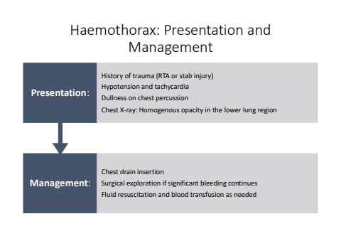 Haemothorax: Presentation and ManagementManagement:Chest drain insertionSurgical exploration if significant bleeding continuesFluid resuscitation and blood transfusion as neededPresentation:History of trauma (RTA or stab injury)Hypotension and tachycardiaDullness on chest percussionChest X-ray: Homogenous opacity in the lower lung region