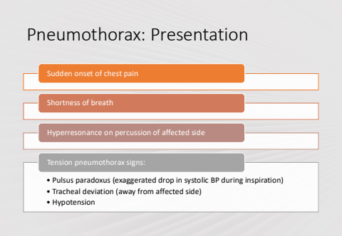 Pneumothorax: PresentationSudden onset of chest painShortness of breathHyperresonance on percussion of affected side%u2022 Pulsus paradoxus (exaggerated drop in systolic BP during inspiration)%u2022 Tracheal deviation (away from affected side)%u2022 HypotensionTension pneumothorax signs: