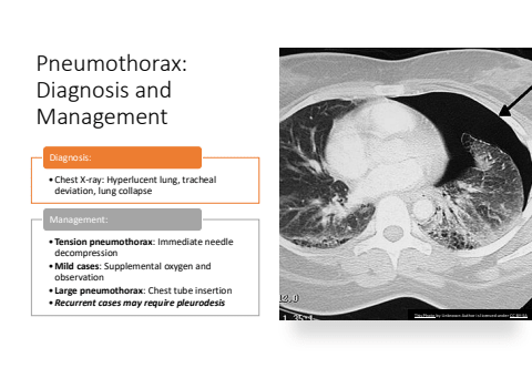 Pneumothorax: Diagnosis and Management%u2022Chest X-ray: Hyperlucent lung, tracheal deviation, lung collapseDiagnosis:%u2022Tension pneumothorax: Immediate needle decompression%u2022Mild cases: Supplemental oxygen and observation%u2022Large pneumothorax: Chest tube insertion%u2022Recurrent cases may require pleurodesisManagement:This Photo by Unknown Author is licensed under CC BY-SA