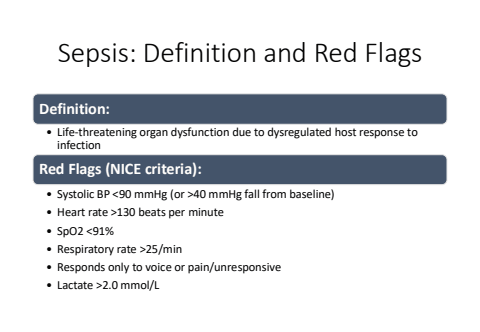 Sepsis: Definition and Red FlagsDefinition:%u2022 Life-threatening organ dysfunction due to dysregulated host response to infectionRed Flags (NICE criteria):%u2022 Systolic BP <90 mmHg (or >40 mmHg fall from baseline)%u2022 Heart rate >130 beats per minute%u2022 SpO2 <91%%u2022 Respiratory rate >25/min%u2022 Responds only to voice or pain/unresponsive%u2022 Lactate >2.0 mmol/L