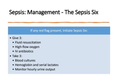 Sepsis: Management - The Sepsis SixIf any red flag present, initiate Sepsis Six:%u2022 Give 3:%u2022 Fluid resuscitation%u2022 High-flow oxygen%u2022 IV antibiotics%u2022 Take 3:%u2022 Blood cultures%u2022 Hemoglobin and serial lactates%u2022 Monitor hourly urine output