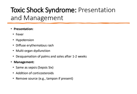 Toxic Shock Syndrome: Presentation and Management%u2022 Presentation:%u2022 Fever%u2022 Hypotension%u2022 Diffuse erythematous rash%u2022 Multi-organ dysfunction%u2022 Desquamation of palms and soles after 1-2 weeks%u2022 Management:%u2022 Same as sepsis (Sepsis Six)%u2022 Addition of corticosteroids%u2022 Remove source (e.g., tampon if present)