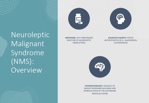Neuroleptic Malignant Syndrome (NMS): OverviewDEFINITION: LIFE-THREATENING REACTION TO NEUROLEPTIC MEDICATIONSCAUSATIVE AGENTS: POTENT ANTIPSYCHOTICS (E.G., HALOPERIDOL, FLUPHENAZINE)PATHOPHYSIOLOGY: THOUGHT TO INVOLVE DOPAMINE BLOCKADE AND DYSREGULATION OF THE AUTONOMIC NERVOUS SYSTEM