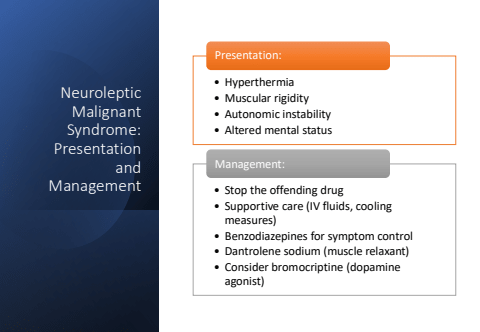 Neuroleptic Malignant Syndrome: Presentation and Management%u2022 Hyperthermia%u2022 Muscular rigidity%u2022 Autonomic instability%u2022 Altered mental statusPresentation:%u2022 Stop the offending drug%u2022 Supportive care (IV fluids, cooling measures)%u2022 Benzodiazepines for symptom control%u2022 Dantrolene sodium (muscle relaxant)%u2022 Consider bromocriptine (dopamine agonist)Management: