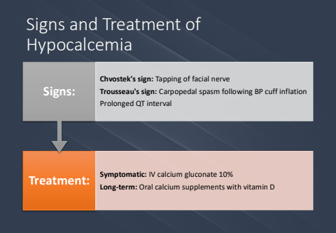 Signs and Treatment of HypocalcemiaTreatment: Symptomatic: IV calcium gluconate 10%Long-term: Oral calcium supplements with vitamin DSigns:Chvostek's sign: Tapping of facial nerveTrousseau's sign: Carpopedal spasm following BP cuff inflationProlonged QT interval