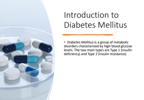 Introduction to Diabetes Mellitus%u2022 Diabetes Mellitus is a group of metabolic disorders characterized by high blood glucose levels. The two main types are Type 1 (insulin deficiency) and Type 2 (insulin resistance).
