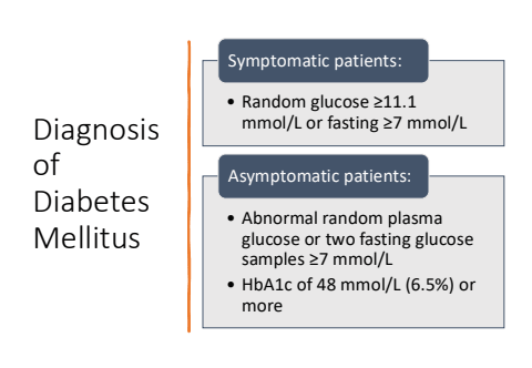 Diagnosis of Diabetes Mellitus%u2022 Random glucose %u226511.1 mmol/L or fasting %u22657 mmol/LSymptomatic patients:%u2022 Abnormal random plasma glucose or two fasting glucose samples %u22657 mmol/L%u2022 HbA1c of 48 mmol/L (6.5%) or moreAsymptomatic patients: