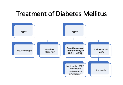 Treatment of Diabetes MellitusType 1:Insulin therapyType 2:First-line: MetforminDual-therapy and Triple-therapy (if HbA1c >6.5%):Metformin + (DPP4 inhibitor / sulfonylurea / pioglitazone)If HbA1c is still >6.5%:Add Insulin