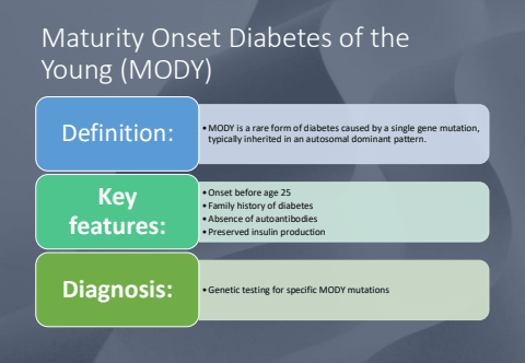 Maturity Onset Diabetes of the Young (MODY)%u2022MODY is a rare form of diabetes caused by a single gene mutation, Definition: typically inherited in an autosomal dominant pattern.%u2022Onset before age 25%u2022Family history of diabetes%u2022Absence of autoantibodies%u2022Preserved insulin productionKey features:Diagnosis: %u2022Genetic testing for specific MODY mutations