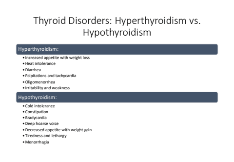 Thyroid Disorders: Hyperthyroidism vs. HypothyroidismHyperthyroidism:%u2022Increased appetite with weight loss%u2022Heat intolerance%u2022Diarrhea%u2022Palpitations and tachycardia%u2022Oligomenorrhea%u2022Irritability and weaknessHypothyroidism:%u2022Cold intolerance%u2022Constipation%u2022Bradycardia%u2022Deep hoarse voice%u2022Decreased appetite with weight gain%u2022Tiredness and lethargy%u2022Menorrhagia