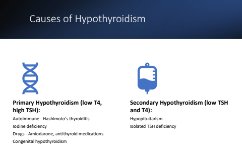 Causes of HypothyroidismPrimary Hypothyroidism (low T4, high TSH):Autoimmune - Hashimoto's thyroiditisIodine deficiencyDrugs - Amiodarone, antithyroid medicationsCongenital hypothyroidismSecondary Hypothyroidism (low TSH and T4):HypopituitarismIsolated TSH deficiency