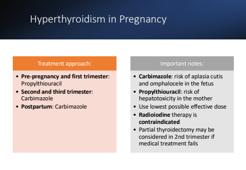 Hyperthyroidism in PregnancyTreatment approach:%u2022 Pre-pregnancy and first trimester: Propylthiouracil%u2022 Second and third trimester: Carbimazole%u2022 Postpartum: CarbimazoleImportant notes:%u2022 Carbimazole: risk of aplasia cutis and omphalocele in the fetus%u2022 Propylthiouracil: risk of hepatotoxicity in the mother%u2022 Use lowest possible effective dose%u2022 Radioiodine therapy is contraindicated%u2022 Partial thyroidectomy may be considered in 2nd trimester if medical treatment fails