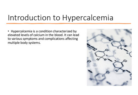 Introduction to Hypercalcemia%u2022 Hypercalcemia is a condition characterized by elevated levels of calcium in the blood. It can lead to various symptoms and complications affecting multiple body systems.
