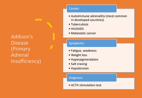 Addison's Disease (Primary Adrenal Insufficiency)%u2022 Autoimmune adrenalitis (most common in developed countries)%u2022 Tuberculosis%u2022 HIV/AIDS%u2022 Metastatic cancerCauses:%u2022 Fatigue, weakness%u2022 Weight loss%u2022 Hyperpigmentation%u2022 Salt craving%u2022 HypotensionSymptoms:%u2022 ACTH stimulation testDiagnosis: