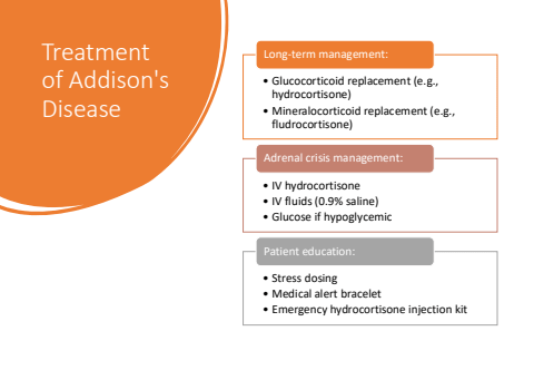 Treatment of Addison's Disease%u2022 Glucocorticoid replacement (e.g., hydrocortisone)%u2022 Mineralocorticoid replacement (e.g., fludrocortisone)Long-term management:%u2022 IV hydrocortisone%u2022 IV fluids (0.9% saline)%u2022 Glucose if hypoglycemicAdrenal crisis management:%u2022 Stress dosing%u2022 Medical alert bracelet%u2022 Emergency hydrocortisone injection kitPatient education: