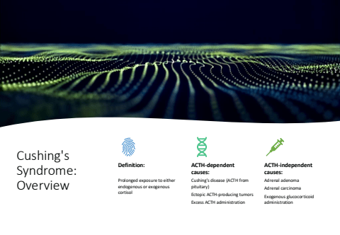 Cushing's Syndrome: OverviewDefinition:Prolonged exposure to either endogenous or exogenous cortisol ACTH-dependent causes:Cushing's disease (ACTH from pituitary)Ectopic ACTH-producing tumorsExcess ACTH administrationACTH-independent causes:Adrenal adenomaAdrenal carcinomaExogenous glucocorticoid administration