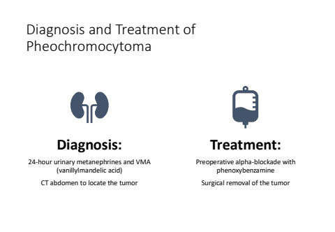 Diagnosis and Treatment of PheochromocytomaDiagnosis:24-hour urinary metanephrines and VMA (vanillylmandelic acid)CT abdomen to locate the tumorTreatment:Preoperative alpha-blockade with phenoxybenzamineSurgical removal of the tumor