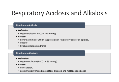 Respiratory Acidosis and Alkalosis%u2022 Definition:%u2022 Hypoventilation (PaCO2 > 45 mmHg)%u2022 Causes:%u2022 Severe asthma or COPD, suppression of respiratory center by opioids,%u2022 obesity%u2022 hypoventilation syndromeRespiratory Acidosis:%u2022 Definition:%u2022 Hyperventilation (PaCO2 < 35 mmHg)%u2022 Causes:%u2022 Panic attack,%u2022 aspirin toxicity (mixed respiratory alkalosis and metabolic acidosis)Respiratory Alkalosis: